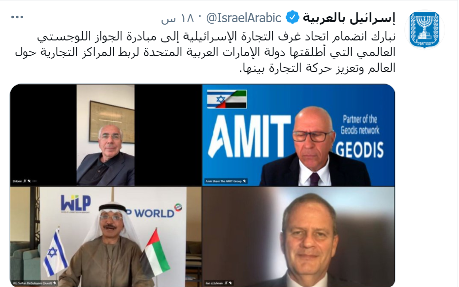 وقالت صفحة "إسرائيل بالعربية" التابعة لوزارة الخارجية الإسرائيلية في تغريدة عبر تويتر: "نبارك انضمام اتحاد غرف التجارة الإسرائيلية إلى مبادرة الجواز اللوجستي العالمي التي أطلقتها دولة الإمارات العربية المتحدة".
