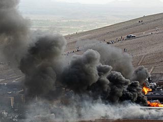 واندلعت النيران بعد انفجار قنبلة في الشاحنات التي كانت تنتظر في موقف غرب العاصمة، قبل دخول المدينة.